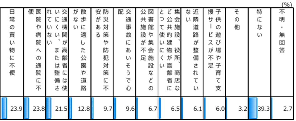 次に、「医院や病院への通院に不便」(23.8%)、「交通機関が高齢者には使いにくい、または整備されていない」(21.5%)、「散歩に適した公園や道路がない」(12.8%)と続く。