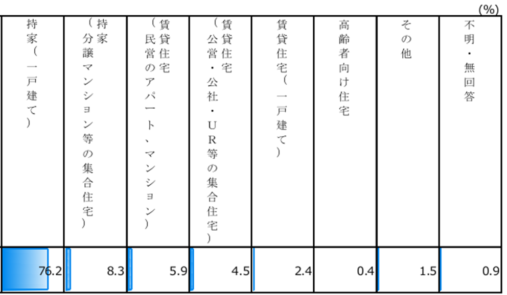 「持家(一戸建て)」、「持家(分譲マンション等の集合住宅)」、「賃貸住宅(民営のアパート、マンション)」、「賃貸住宅(公営・公社・UR等の集合住宅)」、「賃貸住宅(一戸建て)」、「高齢者向け住宅」、「その他」
