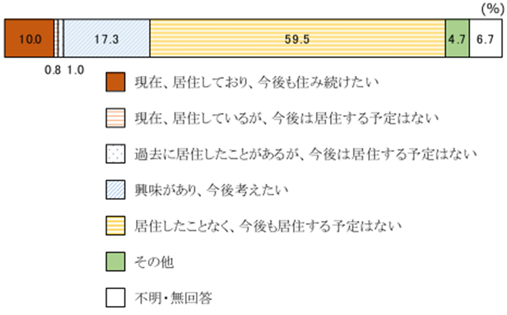 次いで、「興味があり、今後考えたい」(17.3%) 、「現在、居住しており、今後も住み続けたい」(10.0%)が続く。