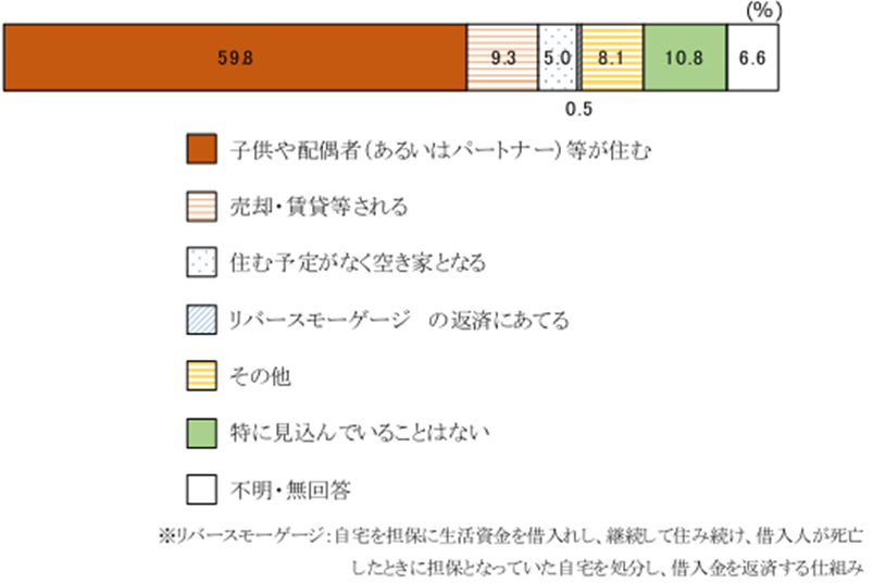 全体で「子供や配偶者(あるいはパートナー)等が住む」(59.8%)が最も高い。次いで、「売却・賃貸等される」(9.3%)が続く。「特に見込んでいることはない」は10.8%。