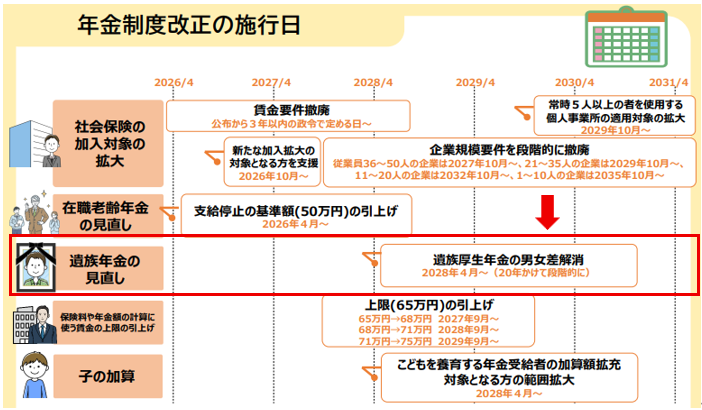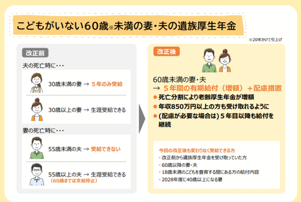 掲載されています図は、「年金制度改正法に関する広報について」厚生労働省 年金局>「年金制度総論」>「遺族年金の見直し」より抜粋しています。