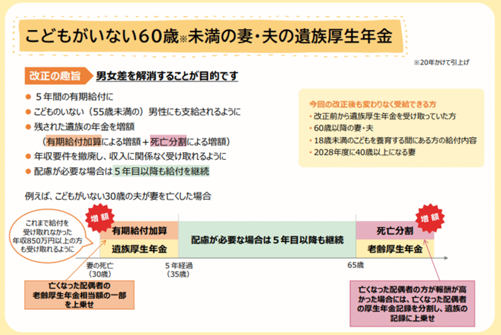今回の改正、5年間の有期給付ですがプラスの部分もあり、増額も検討され、配慮が必要な場合は5年目以降も継続される点、 65歳以降の老齢厚生年金に、亡くなった配偶者の方の報酬が高かった場合には、亡くなった配偶者の厚生年金記録を分割し、遺族の記録に上乗せされる点の配慮もあるようです。