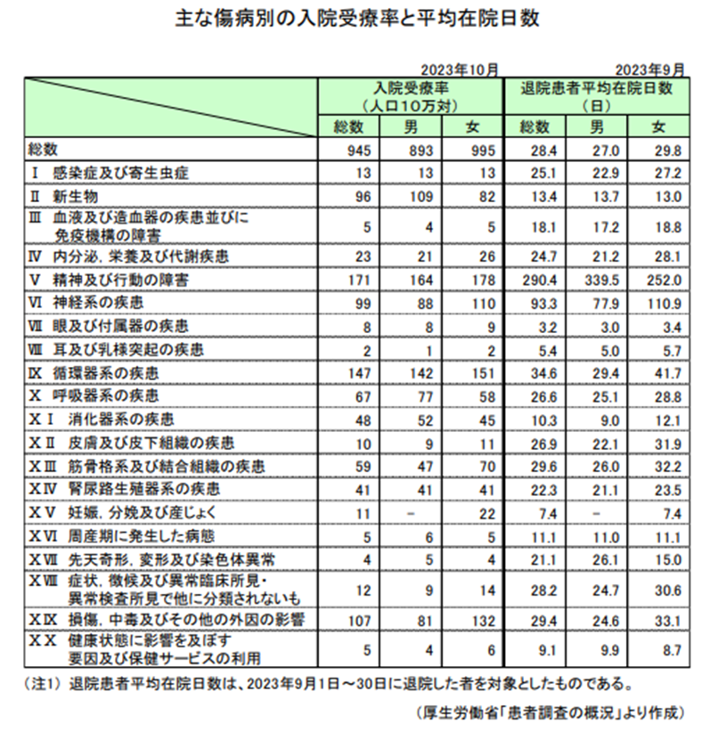 主な傷病別にみた入院受療率と平均在院日数です。入院受療率は人口10万人に対する人数、退院患者平均在院日数は日数を示しています。