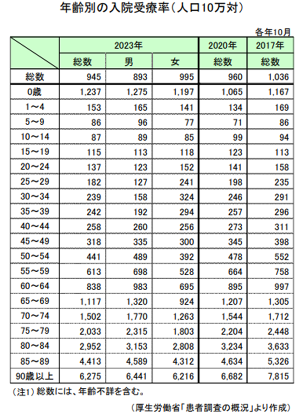 人口10万人に対し、どれだけの人が入院受療しているかを年齢・性別ごとに示しています。