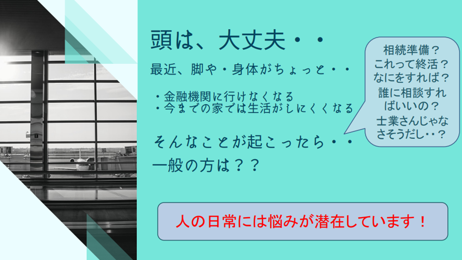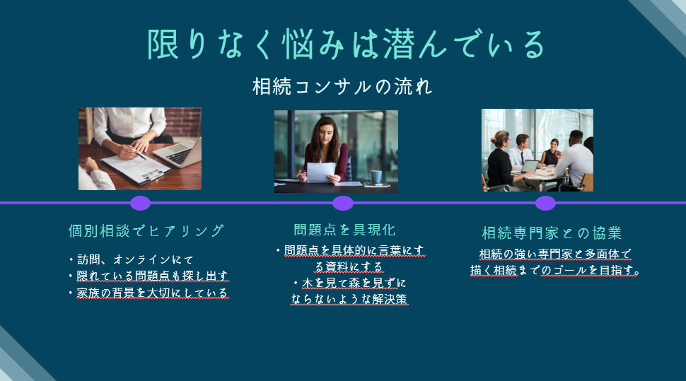 「相続相談」とは言っておりますが、相談者様がまだまだこれから残された人生を安心に生きて頂かなければなりません。介護問題だったり、墓守問題だったり、時には人生設計だったり・・。